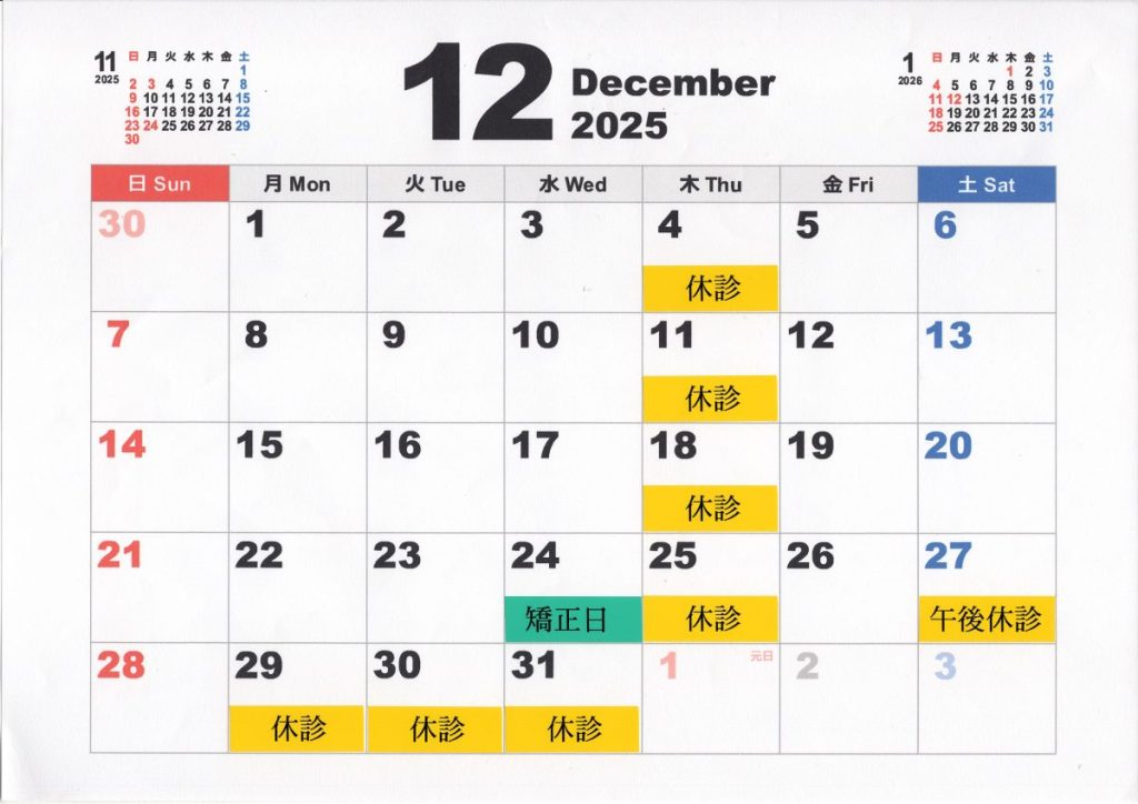 2025年11月26日 お知らせ 12月休診のお知らせ 12月の休診日は以下の通りとなります。 日曜・祝日は休診となります。 ・1週目 4日(木) ・2週目 7日(日)・11日(木) ・3週目 14日(日)・18日(木) ・4週目 21日(日)・24日(水) AM・25日(木)・27日(土)PM ・5週目 28日(日)•29日(月)•30日(火)•31日(水) ご迷惑おかけいたしますが、よろしくお願いいたします。 ※24日(水)は矯正日の為、一般の診療は受け付けておりません