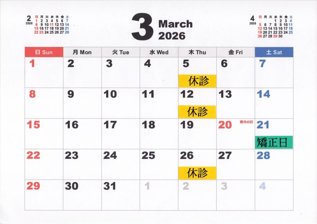 2026年02月21日 お知らせ 3月休診のお知らせ 3月の休診日は以下の通りとなります。 日曜・祝日は休診となります。 ・1週目 1日(日)・5日(木) ・2週目 8日(日)・12日(木) ・3週目 15日(日)・20日(金祝)・21日(土) PM ・4週目 22日(日)・26日(木) ・5週目 29日(日) ご迷惑おかけいたしますが、よろしくお願いいたします。 ※21日(土)は矯正日の為、一般の診療は受け付けておりません
