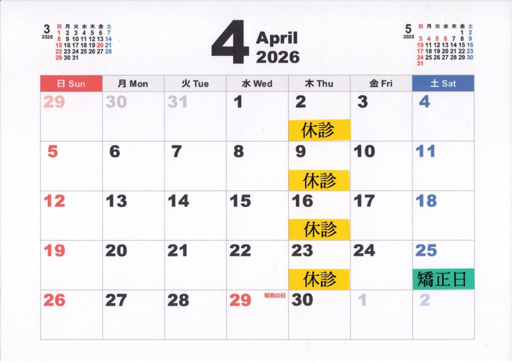 2026年03月13日 お知らせ 4月休診のお知らせ 4月の休診日は以下の通りとなります。 日曜・祝日は休診となります。 ・1週目 2日(木) ・2週目 5日(日)・9日(木) ・3週目 12日(日)・16日(木) ・4週目 19日(日)・23日(木)・25日(土) PM ・5週目 26日(日)・29日(水祝) ご迷惑おかけいたしますが、よろしくお願いいたします。 ※25日(土)は矯正日の為、一般の診療は受け付けておりません